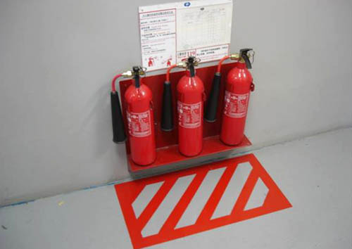 7、装备国家消防规范规则的灭火器。灭火器装入专用的灭火器箱,灭火器箱靠墙放置,并画制止堵塞线。灭火器箱上方设置灭火器定置标识,灭火器责任人,编号等。灭火器箱顶部粘贴灭火器使用方法。